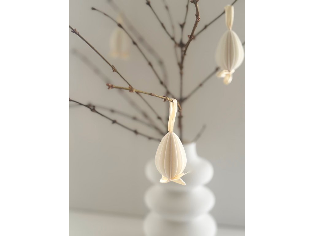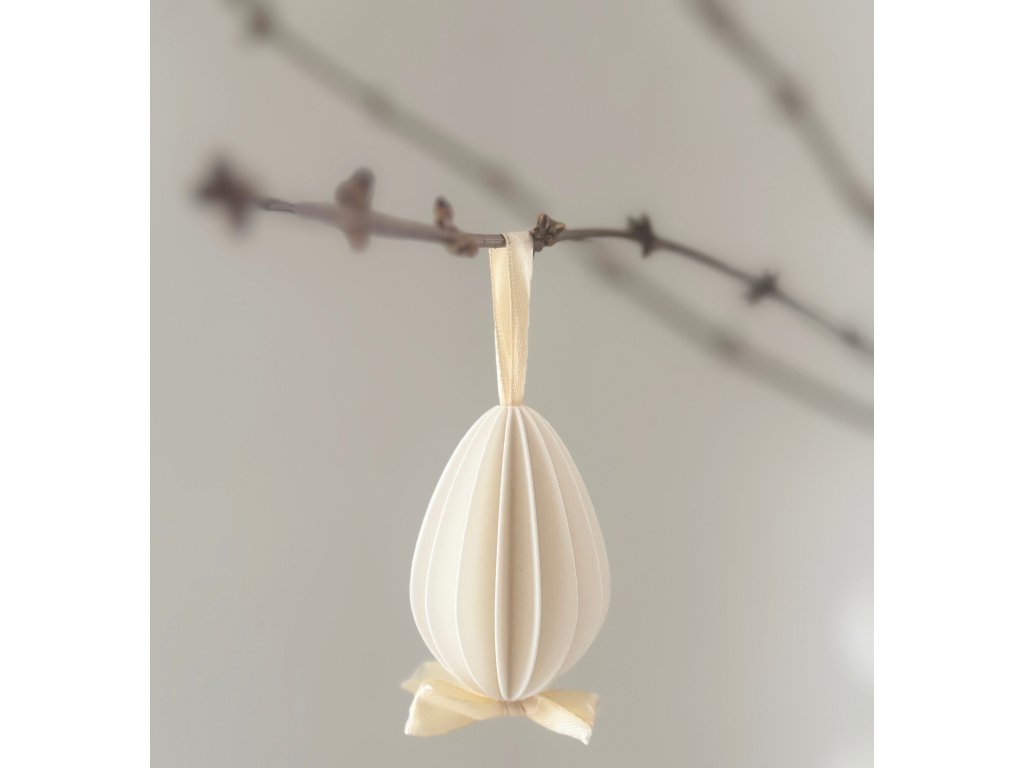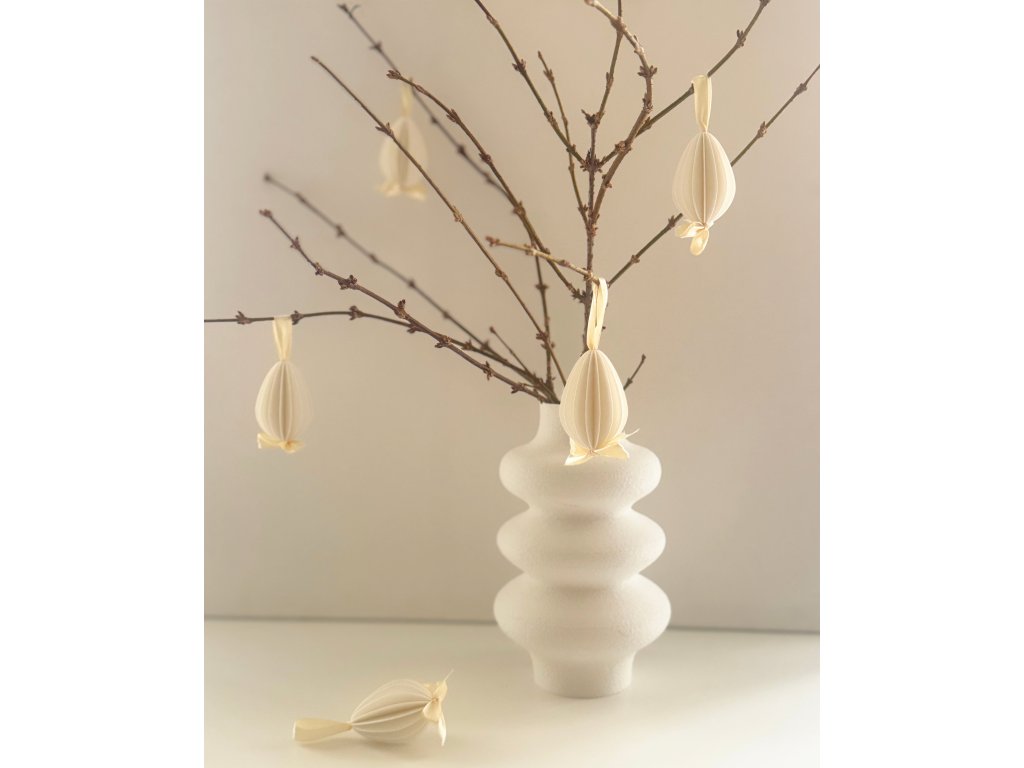 Hledáte alternativu ke klasickým malovaným kraslicím? Vajíčko vnáší do velikonoční výzdoby svěží, architektonický prvek. Jeho tvar tvoří pravidelné svislé lamely, které vytvářejí fascinující hru světla a stínu. Navzdory svému křehkému vzhledu, který připomíná skládaný papír, je díky 3D tisku pevné a odolné.